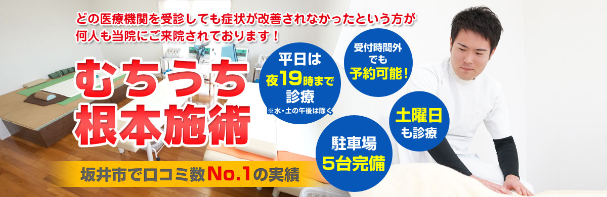 私の接骨院では特殊な治療法を用い、徹底した原因の追究、症状説明を心掛け、患者様の痛みの原因に合わせたオーダーメイドの施術を行っております。